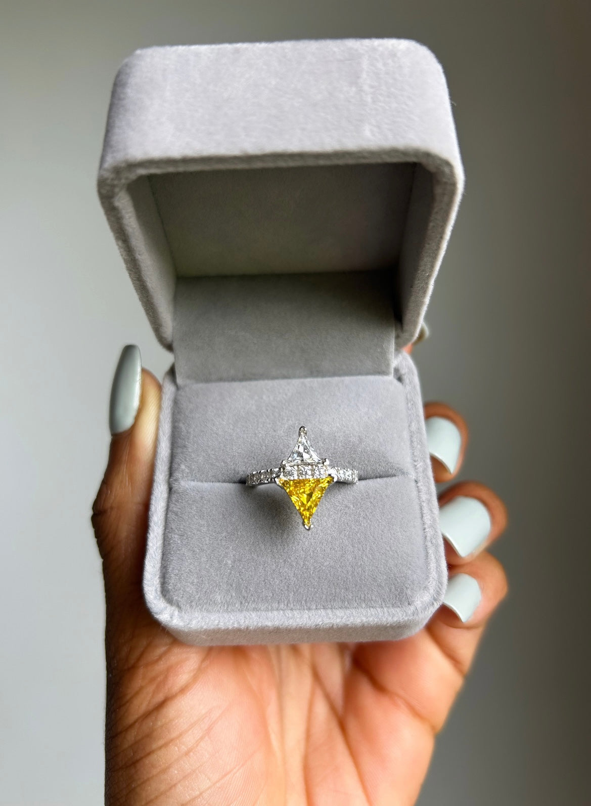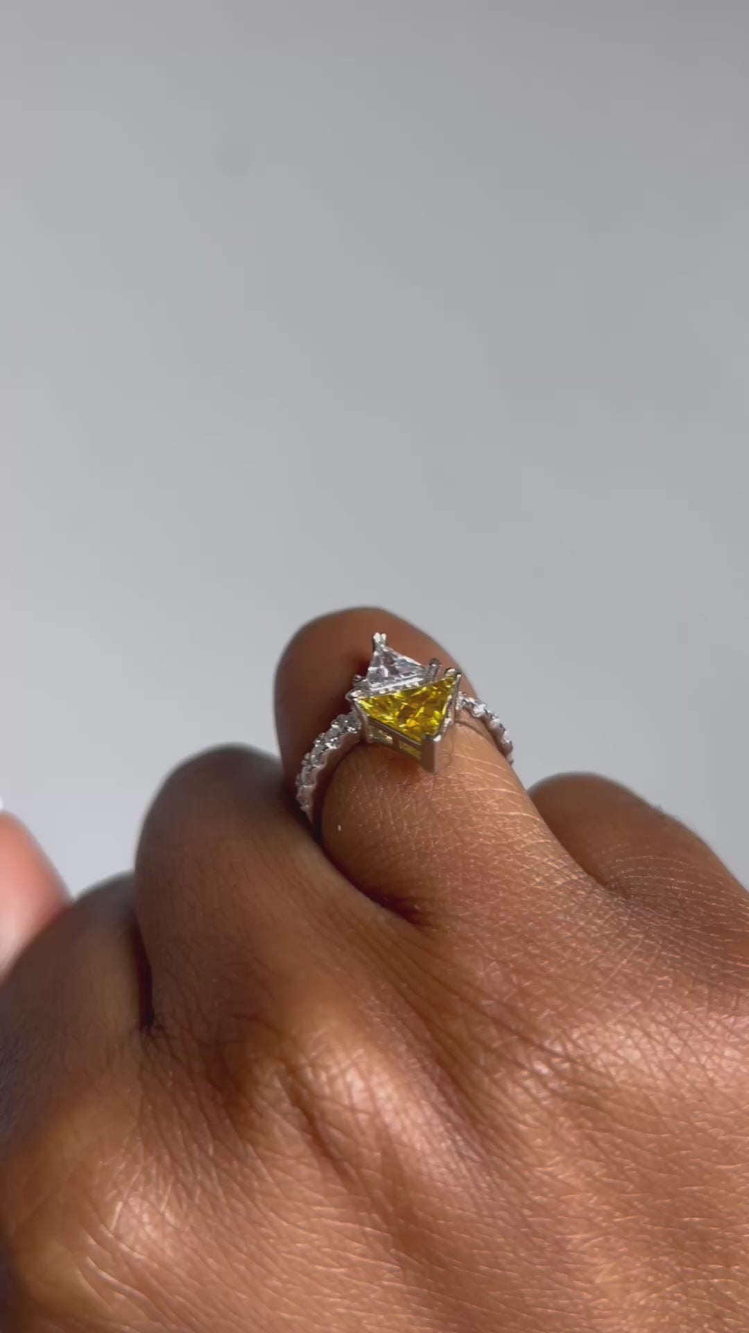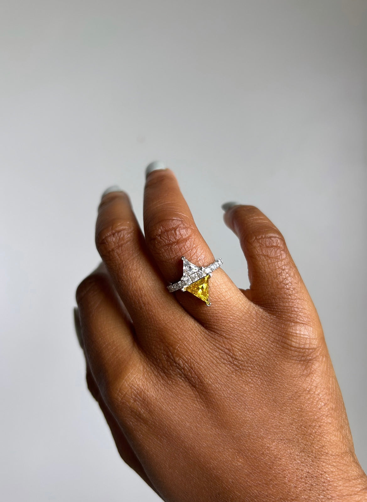 Named after the Venda word for be joyful, Takalani is a celebration of sunshine and laughter woven into a jewel. A striking pairing of a yellow triangular gemstone and a clear triangular cubic zirconia forms a marquise-inspired silhouette, half golden dawn and half shimmering starlight.